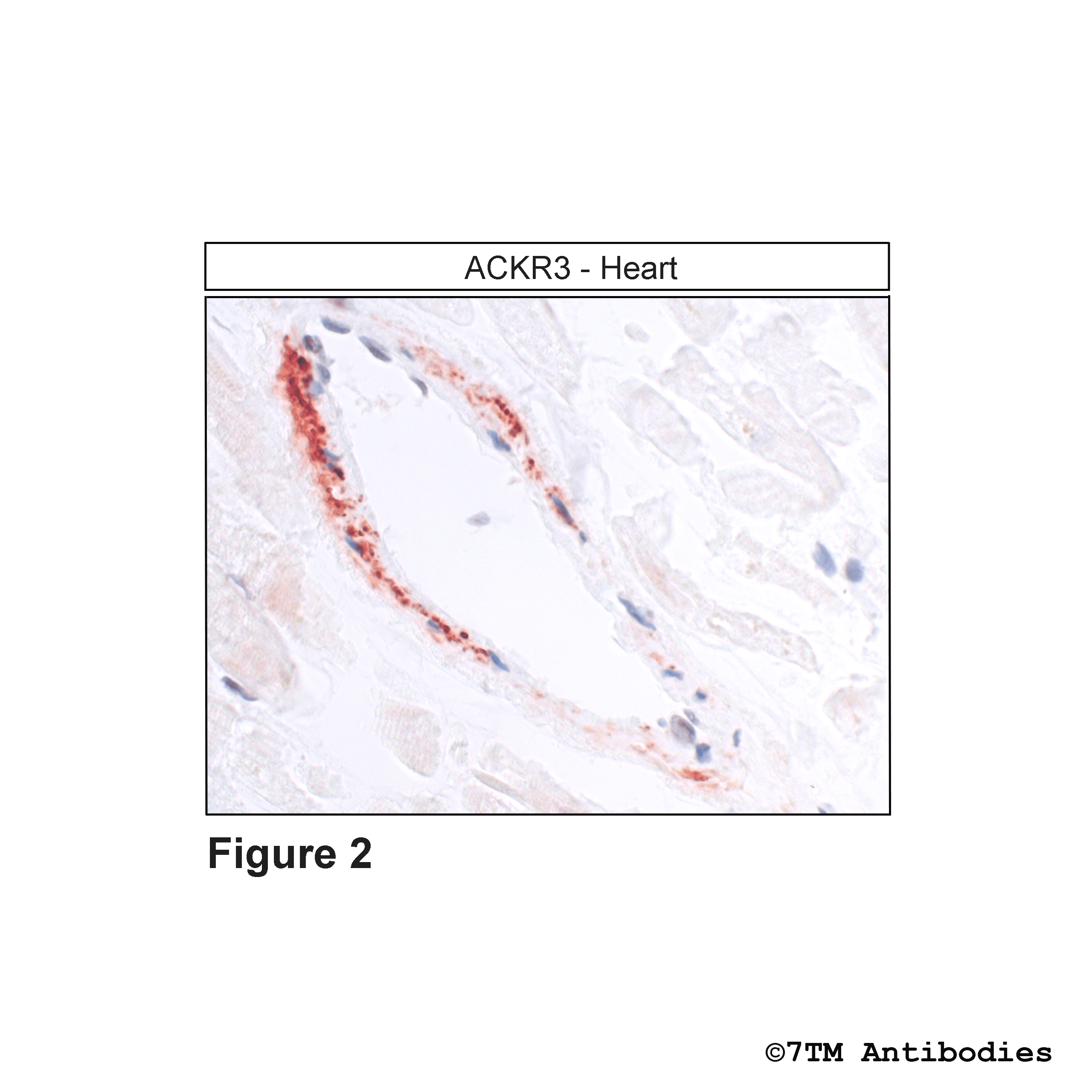 Figure 2. Immunohistochemical identification of Atypical Chemokine Receptor 3 in Heart. Sections were dewaxed, microwaved in citric acid, and incubated with anti-ACKR3 (Atypical Chemokine Receptor 3) antibody (7TM0080N-GP) at a dilution of 1:100. Sections were then sequentially treated with biotinylated anti-guinea pig IgG and avidin-biotin solution.Color was developed by incubation in 3-amino-9-ethylcarbazole (AEC), and sections were counterstained with hematoxylin.