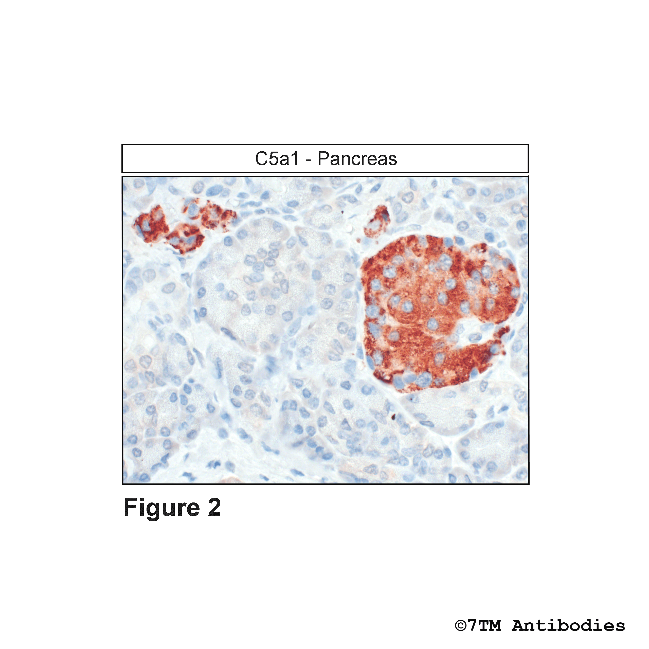 The non-phospho-C5a1 receptor antibody is directed against the distal end of the carboxyl-terminal tail of human C5a1. It can be used to detect total C5a1 receptors in Western blots independent of phosphorylation. The non-phospho-C5a1 antibody can also be used to isolate and enrich C5a1 receptors from cell and tissue lysates. It also detects C5a1 in cultured cells and tissue sections by immunohistochemistry.