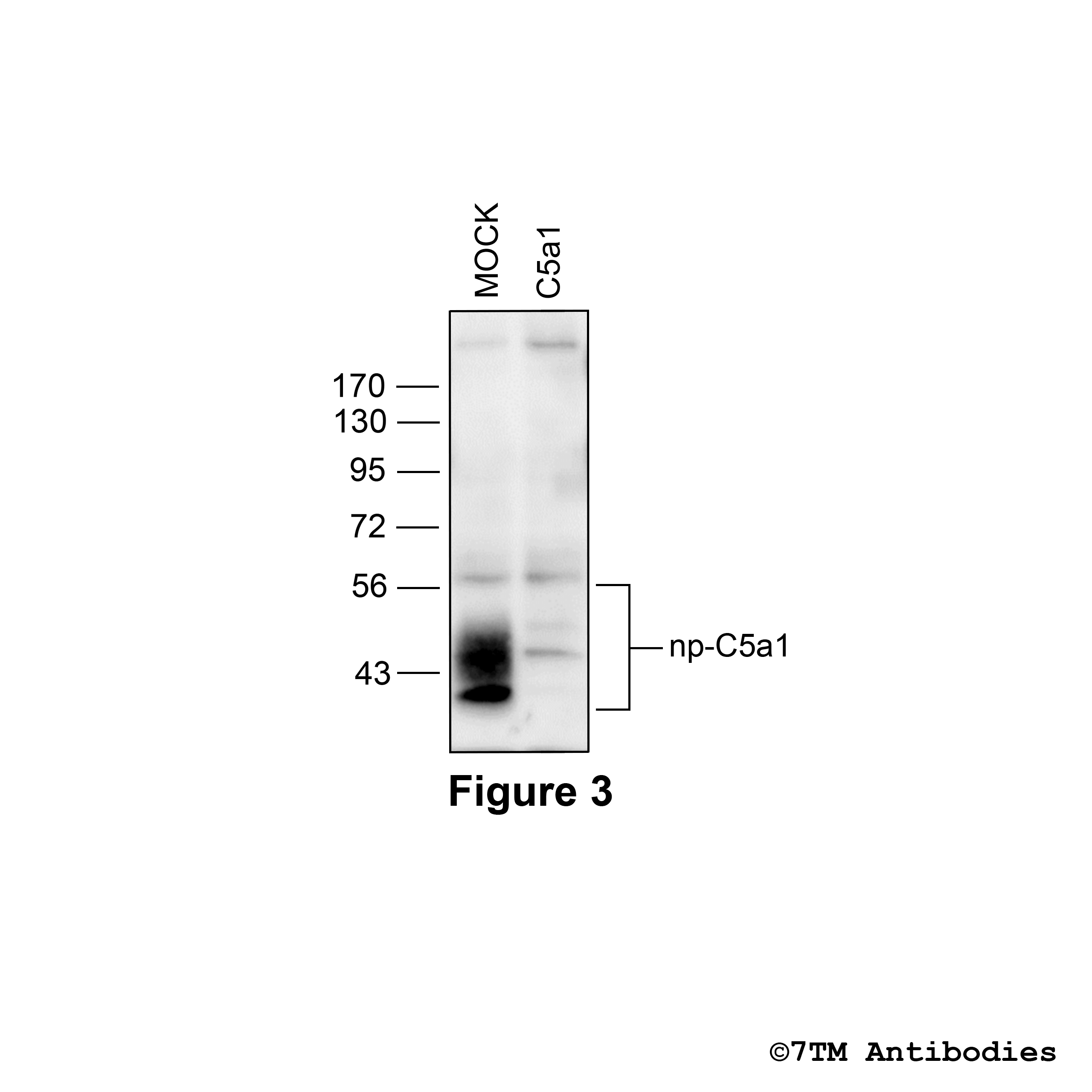 Figure 3. Validation of the Complement C5a Receptor 1 in transfected HEK293 cells. Native HEK293 cells (MOCK) or HEK293 cells stably expressing the Complement C5a Receptor 1 (C5a1) were lysed and immunoblotted with the anti-C5a1 antibody (7TM0032N-ICGP) at a dilution of 1:1000.