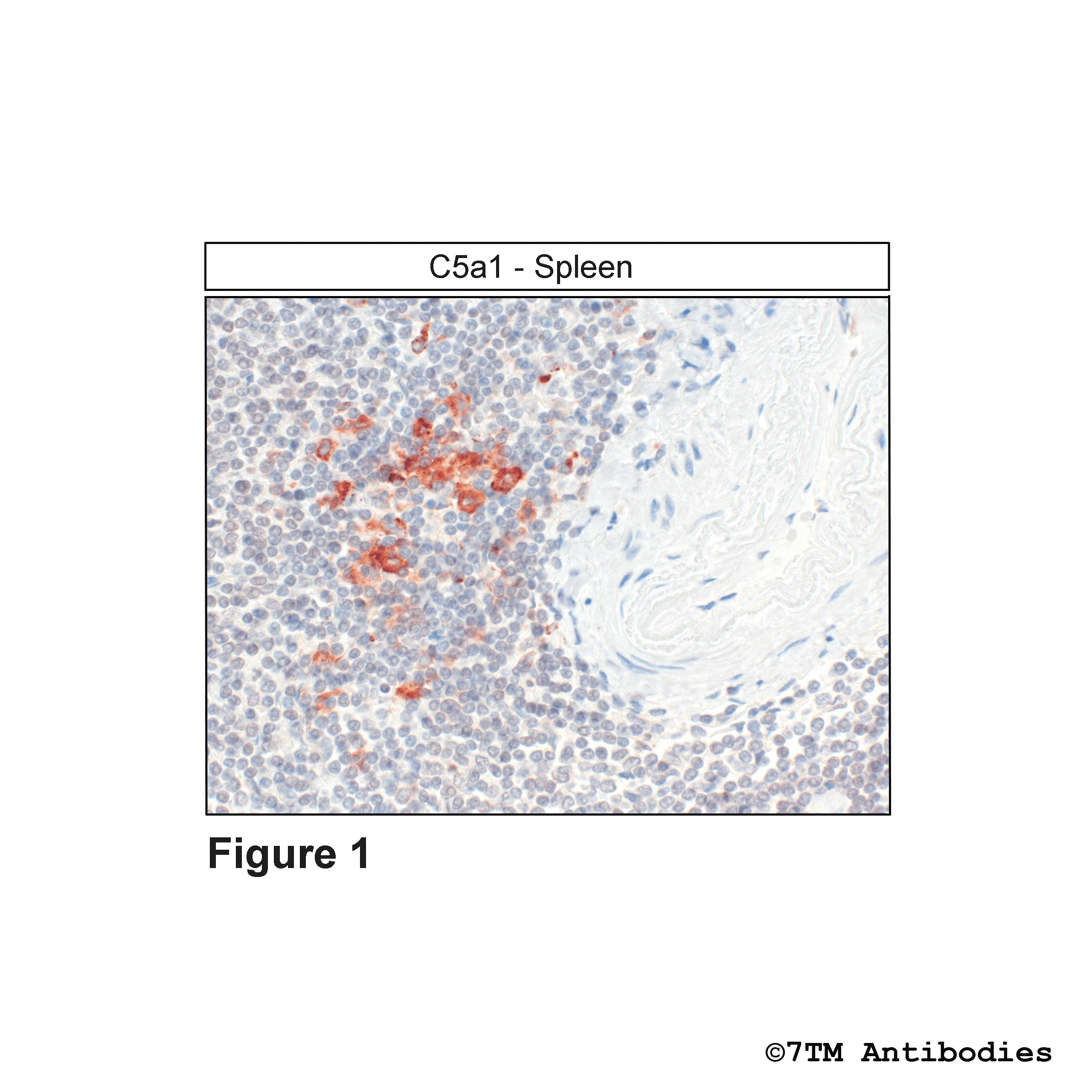 Figure 1. Immunohistochemical identification of Complement C5a Receptor 1 in Spleen. Sections were dewaxed, microwaved in citric acid, and incubated with anti-C5a1 (Complement C5a Receptor 1) antibody (7TM0032N-ICGP) at a dilution of 1:100. Sections were then sequentially treated with biotinylated anti-Guinea Pig IgG and avidin-biotin solution.Color was developed by incubation in 3-amino-9-ethylcarbazole (AEC), and sections were counterstained with hematoxylin.