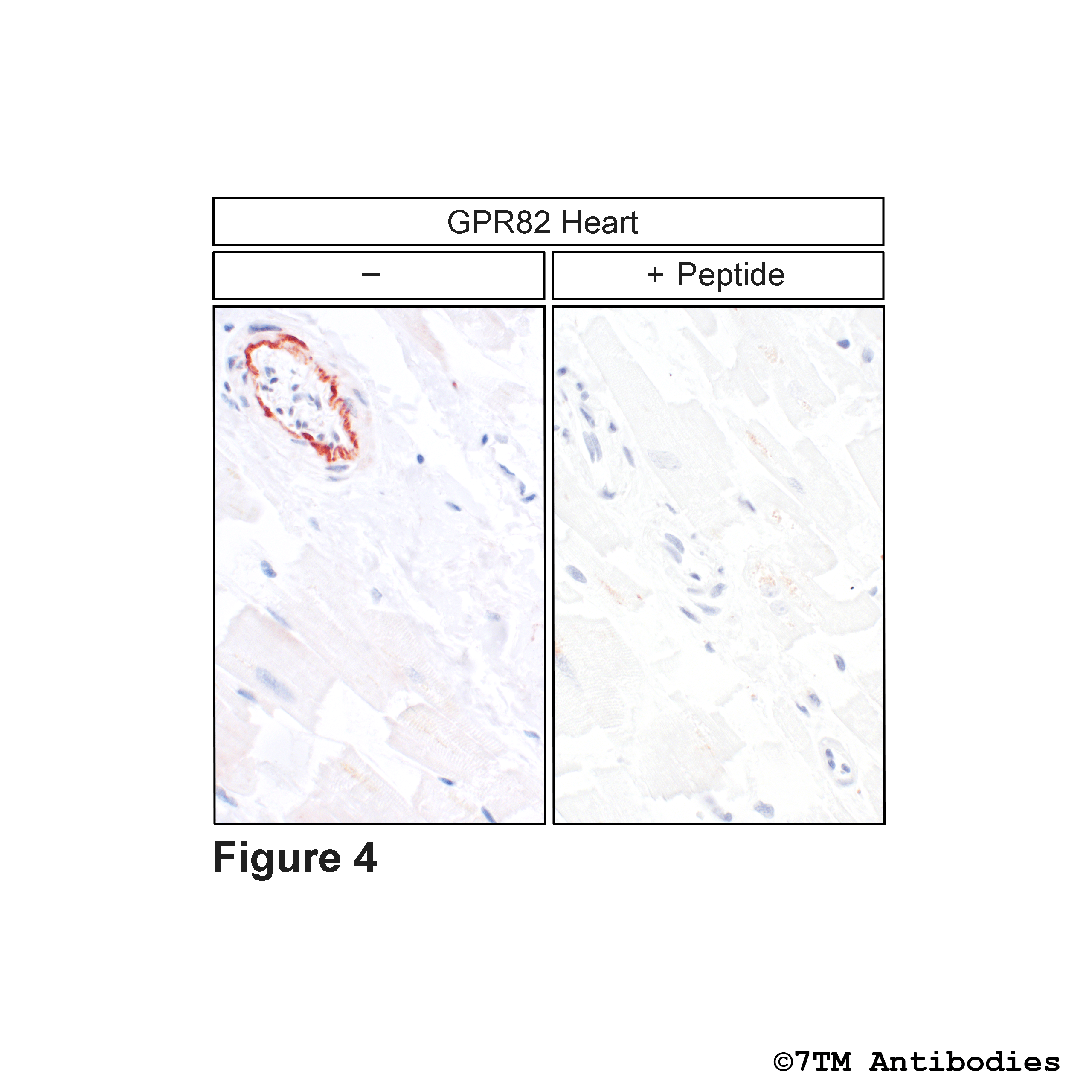 The GPR82 antibody is directed against the distal end of the carboxyl-terminal tail of mouse, rat and human GRP82. It can be used to detect total GPR82 receptors in Western blots independent of phosphorylation. The GPR82 antibody can also be used to isolate and enrich GPR82 receptors from brain lysates. It also detects GPR82 in cultured cells and tissue sections by immunohistochemistry.