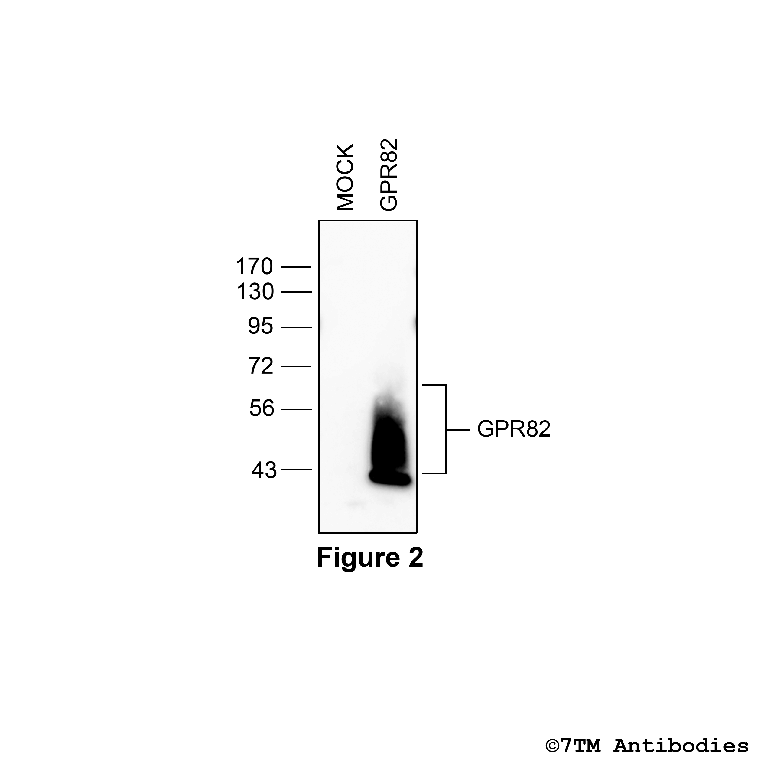 Figure 3. Validation of the G protein-coupled receptor 32 in transfected HEK293 cells. Native HEK293 cells (MOCK) or HEK293 cells stably expressing the G protein-coupled receptor 32 (GPR32) were lysed and immunoblotted with the phosphorylation-independent anti-GPR32 antibody (7TM0099N-IC) at a dilution of 1:1000.