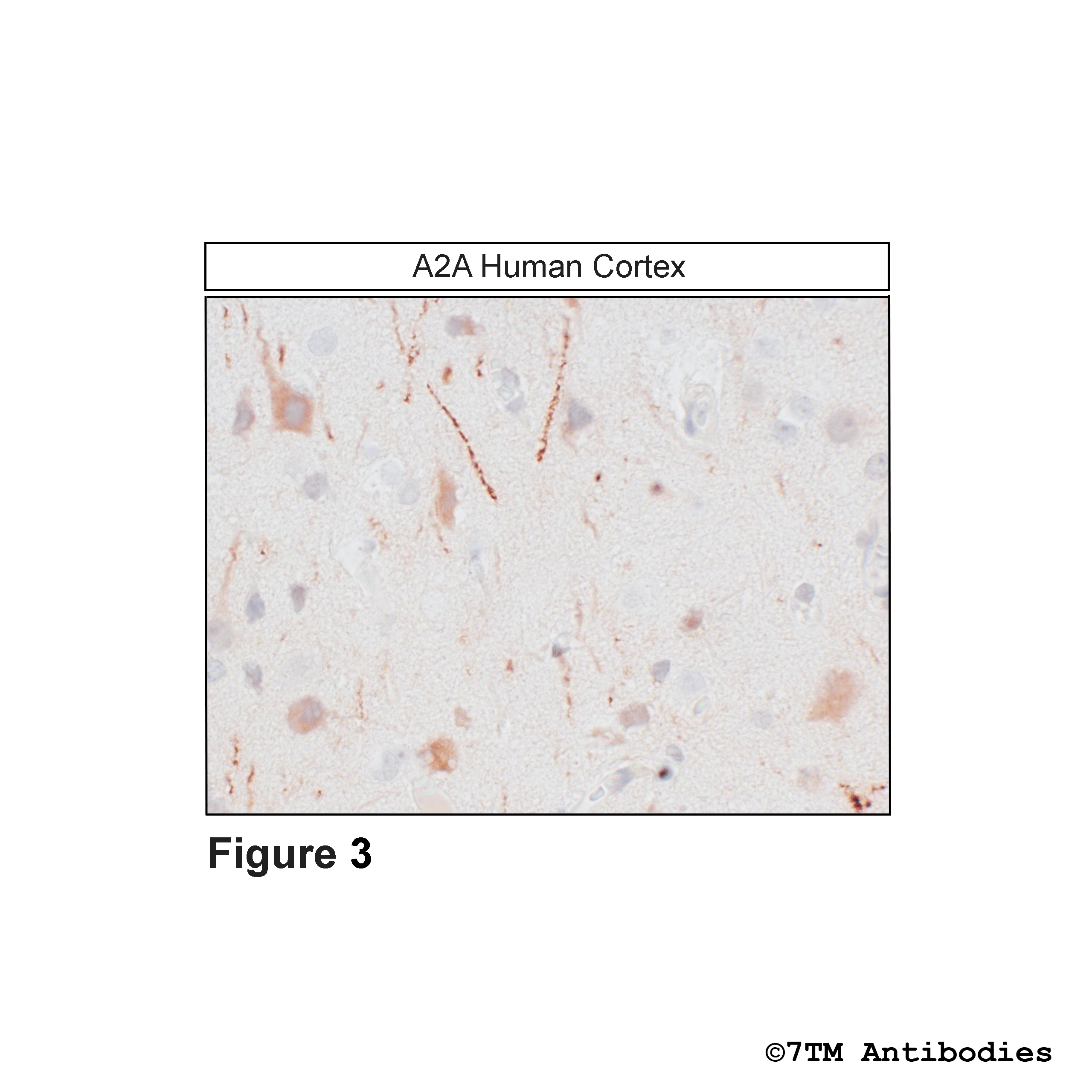 Figure 3. Immunohistochemical identification of the A2A Adenosine Receptor in human cortex. Sections were dewaxed, microwaved in citric acid, and incubated with anti-A2A (A2A Adenosine Receptor) antibody (7TM0019N) at a dilution of 1:100. Sections were then sequentially treated with biotinylated anti-rabbit IgG and avidin-biotin solution.Color was developed by incubation in 3-amino-9-ethylcarbazole (AEC), and sections were counterstained with hematoxylin.