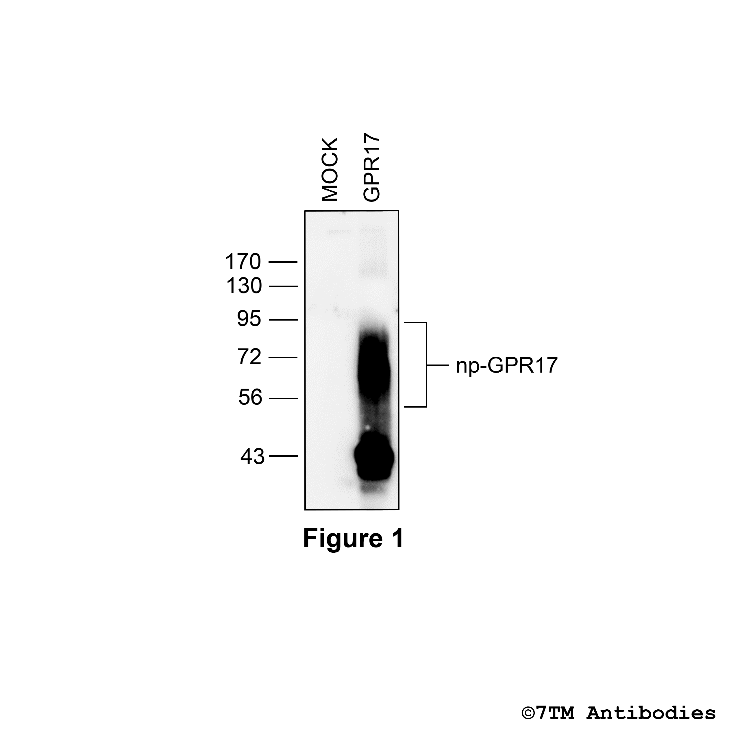 Figure 1. Validation of the G Protein-coupled Receptor 17 in transfected HEK293 cells. Native HEK293 cells (MOCK) or HEK293 cells stably expressing the G Protein-coupled Receptor 17 (GPR17) were lysed and immunoblotted with the phosphorylation-independent anti-GPR17 antibody (7TM0088N-GP) at a dilution of 1:1000.