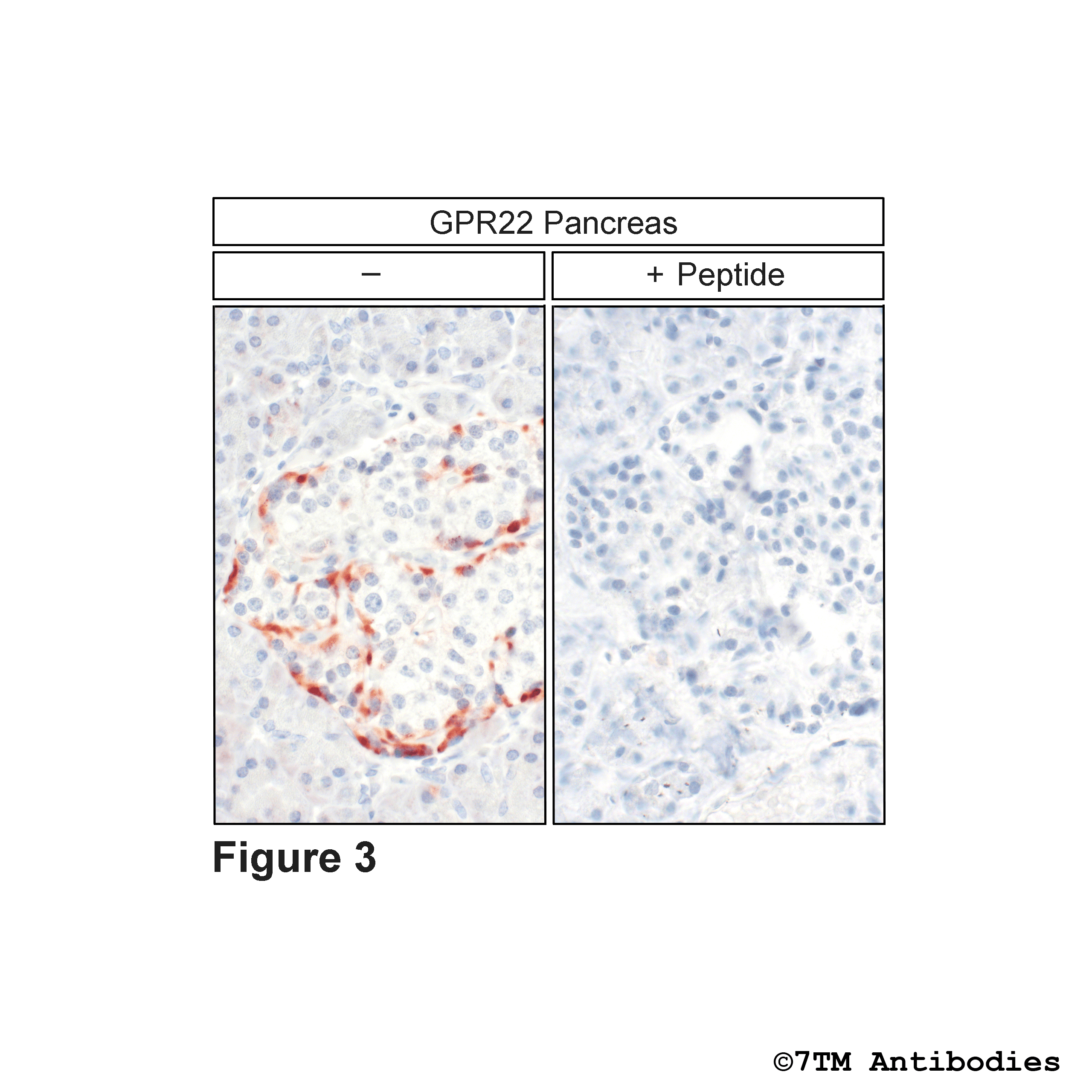 Figure 3. Immunohistochemical varification of  GPR22 Receptor in Pancreas. Sections were dewaxed, microwaved in citric acid, and not exposed (left pannel) or exposed to peptide (right pannel) that was used for production of anti-GPR22 (non-phospho-GPR22 Receptor)) antibody (7TM0093N-IC). Sections were then incubated with anti-GPR22 (non-phospho-GPR22 Receptor) antibody (7TM0093N-IC) at a dilution of 1:100 and sequentially treated with biotinylated anti-rabbit IgG and avidin-biotin solution. Sections were then developed in 3,3-diaminobenzidine (DAB)-glucose oxidase and lightly counterstained with hematoxylin. Note, only in sections without peptide incubation GPR22 receptors were uniformly detected at the plasma membrane of cells.