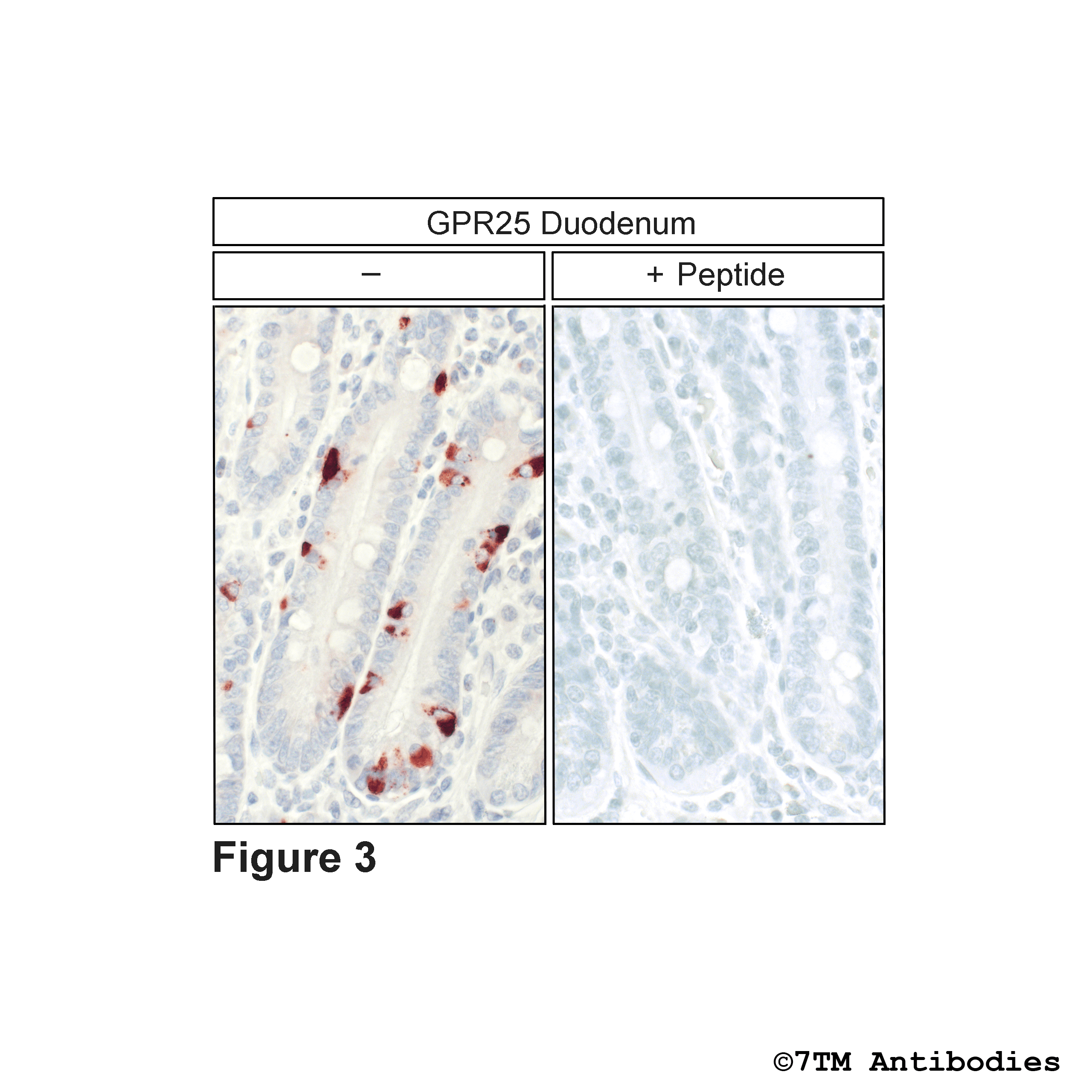 Figure 3. Immunohistochemical varification of GPR25 Receptor antibody in duodenum. Sections were dewaxed, microwaved in citric acid, and not exposed (left pannel) or exposed to peptide (right pannel) that was used for production of anti-GPR25 (non-phospho-GPR25 Receptor)) antibody (7TM0095N-IC). Sections were then incubated with anti-GPR25 (non-phospho-GPR25 Receptor) antibody (7TM0095N-IC) at a dilution of 1:100 and sequentially treated with biotinylated anti-rabbit IgG and avidin-biotin solution. Sections were then developed in 3,3-diaminobenzidine (DAB)-glucose oxidase and lightly counterstained with hematoxylin. Note, only in sections without peptide incubation GPR25 receptors were uniformly detected at the plasma membrane of cells.