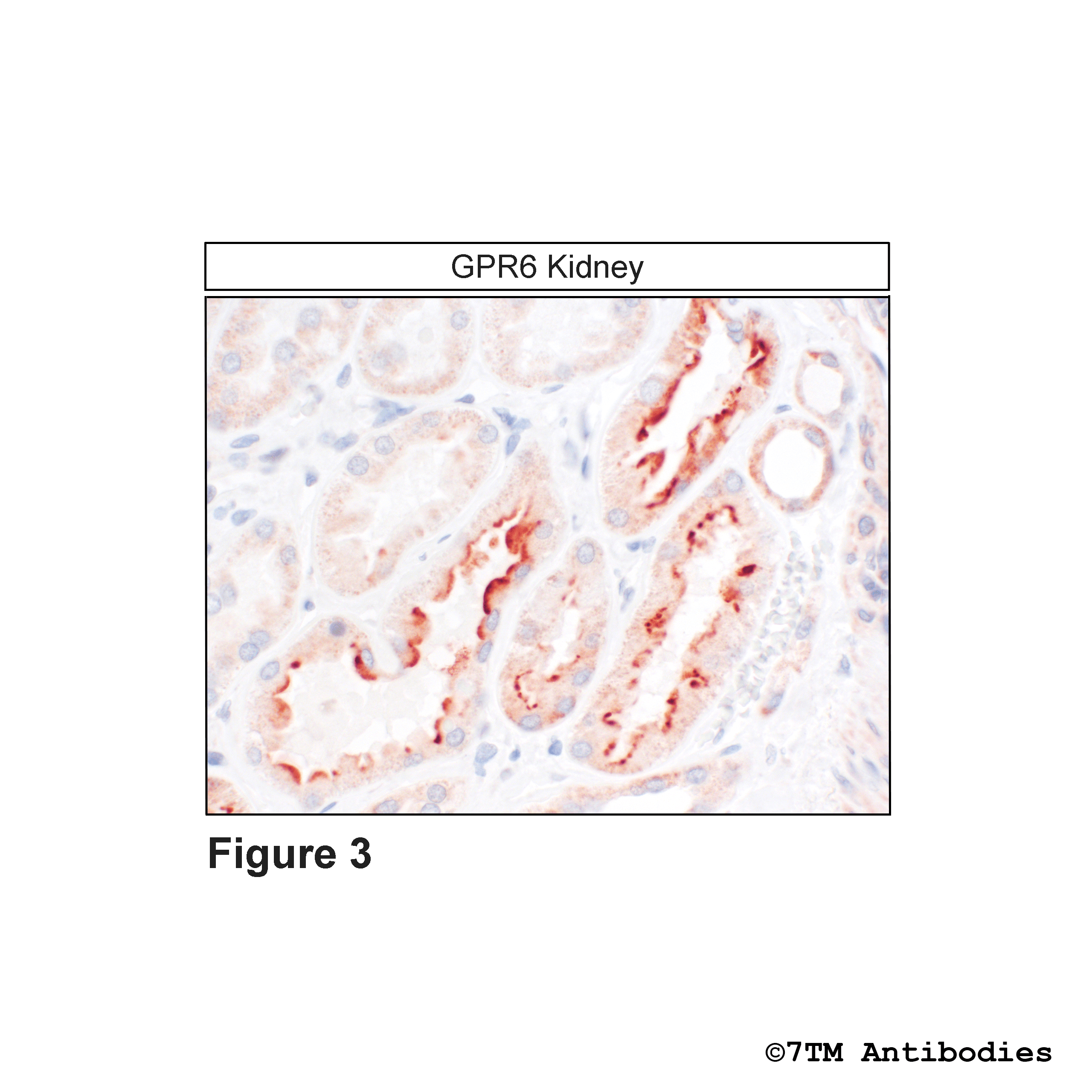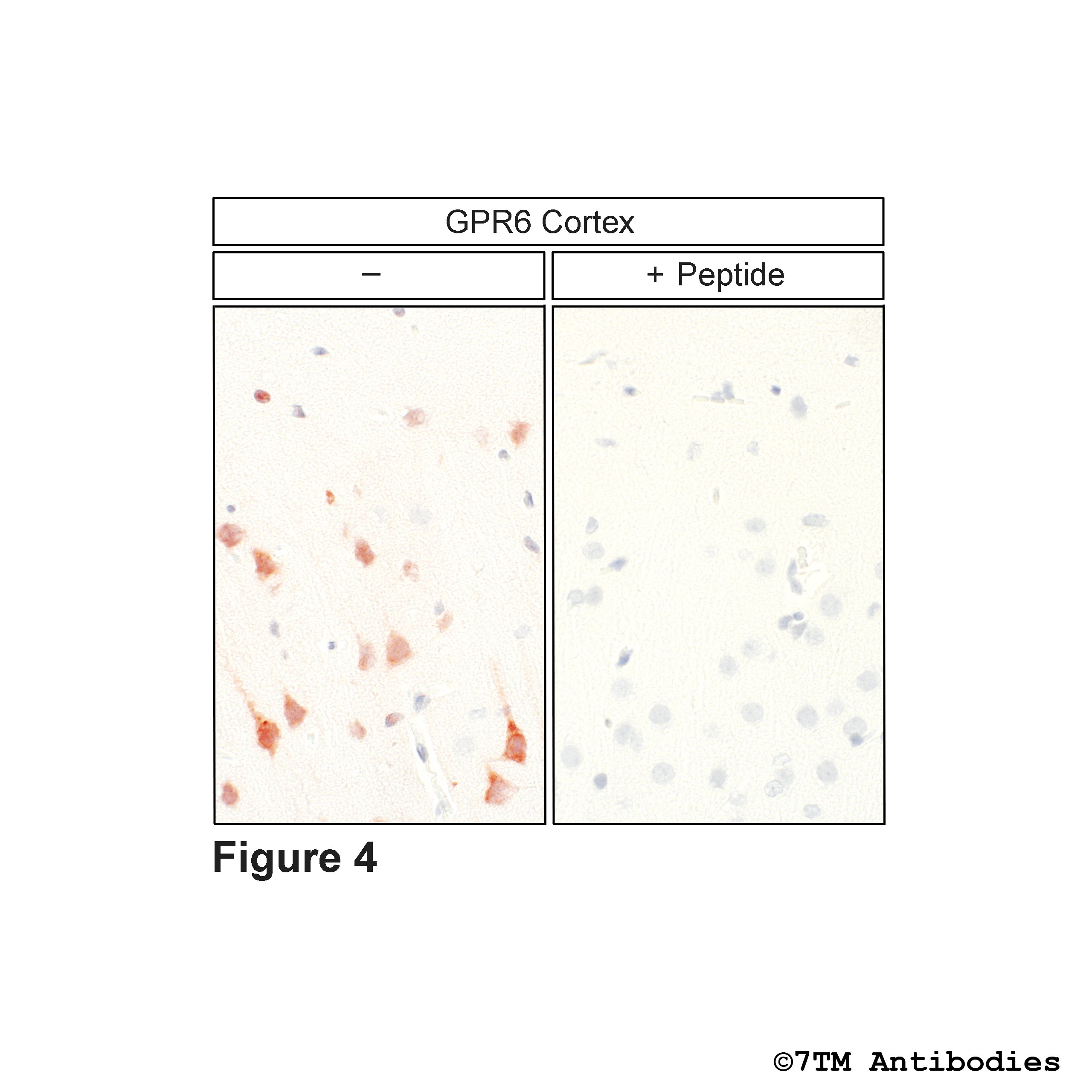 The GPR6 antibody is directed against the distal end of the carboxyl-terminal tail of mouse, rat and human GRP6. It can be used to detect total GPR6 receptors in Western blots independent of phosphorylation. The GPR6 antibody can also be used to isolate and enrich GPR6 receptors from brain lysates. It also detects GPR6 in cultured cells and tissue sections by immunohistochemistry.