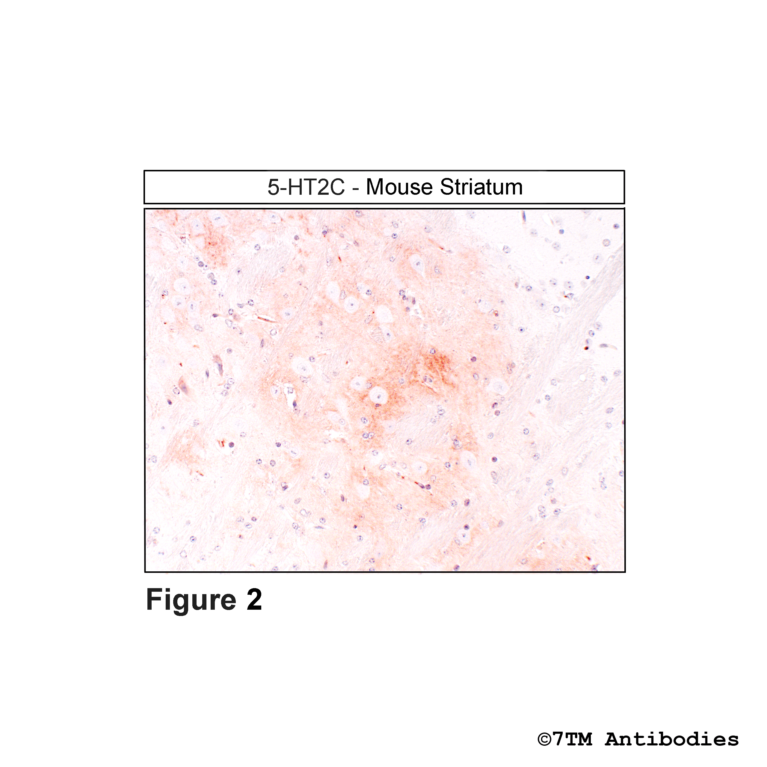 Figure 2. Immunohistochemical varification of 5-Hydroxytryptamine Receptor 2C antibody in Mouse Striatum. Sections were dewaxed, microwaved in citric acid, and incubated with anti-5HT2C (5-Hydroxytryptamine Receptor 2C) antibody (7TM0008N-IC) at a dilution of 1:100. Sections were then sequentially treated with biotinylated anti-rabbit IgG and avidin-biotin solution. Sections were then developed in 3,3-diaminobenzidine (DAB)-glucose oxidase and lightly counterstained with hematoxylin.