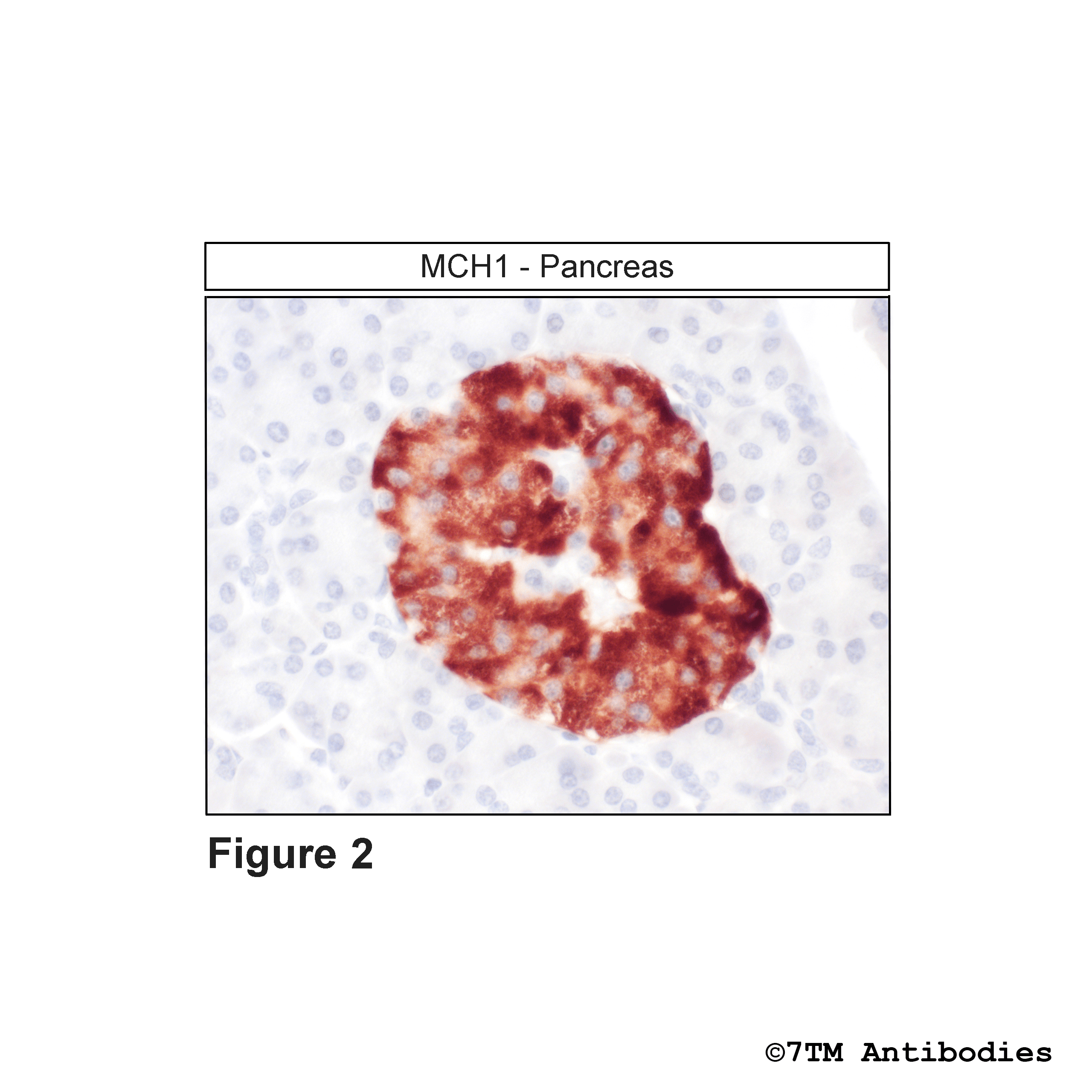 Figure 1. Immunohistochemical identification of Melanin-Concentrating Hormone Receptor 1 in pancreas. Sections were dewaxed, microwaved in citric acid, and incubated with anti-MCH1 (Melanin-Concentrating Hormone Receptor 1) antibody (7TM0280N) at a dilution of 1:100. Sections were then sequentially treated with biotinylated anti-rabbit IgG and avidin-biotin solution. Sections were then developed in 3,3-diaminobenzidine (DAB)-glucose oxidase and lightly counterstained with hematoxylin.