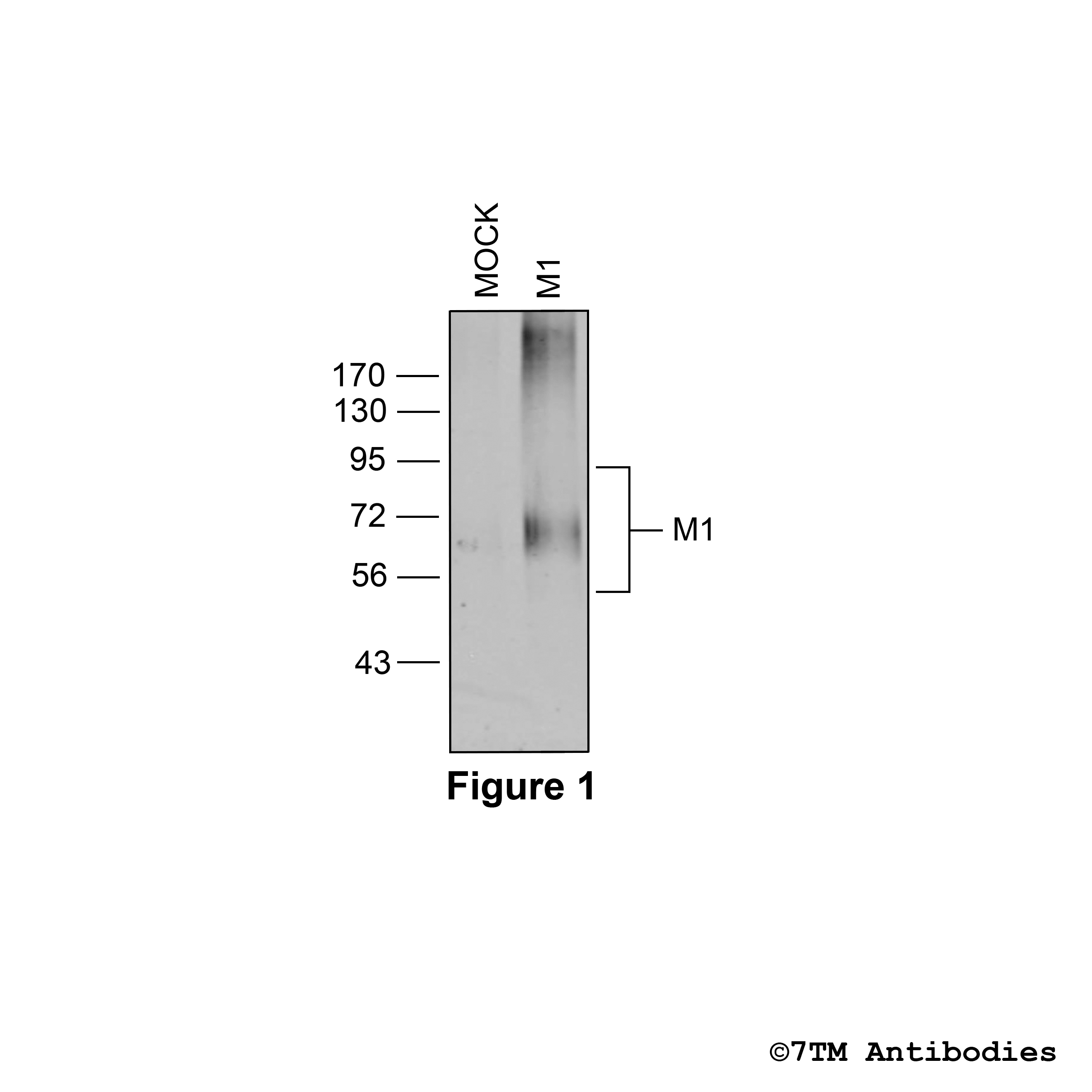 Figure 1. Validation of the M1 Muscarinic Acetylcholine Receptor in transfected HEK293 cells. Native HEK293 cells (MOCK) or HEK293 cells stably expressing the M1 Muscarinic Acetylcholine Receptor (M1) were lysed and immunoblotted with the phosphorylation-independent anti-M1 antibody (7TM0013N) at a dilution of 1:1000.