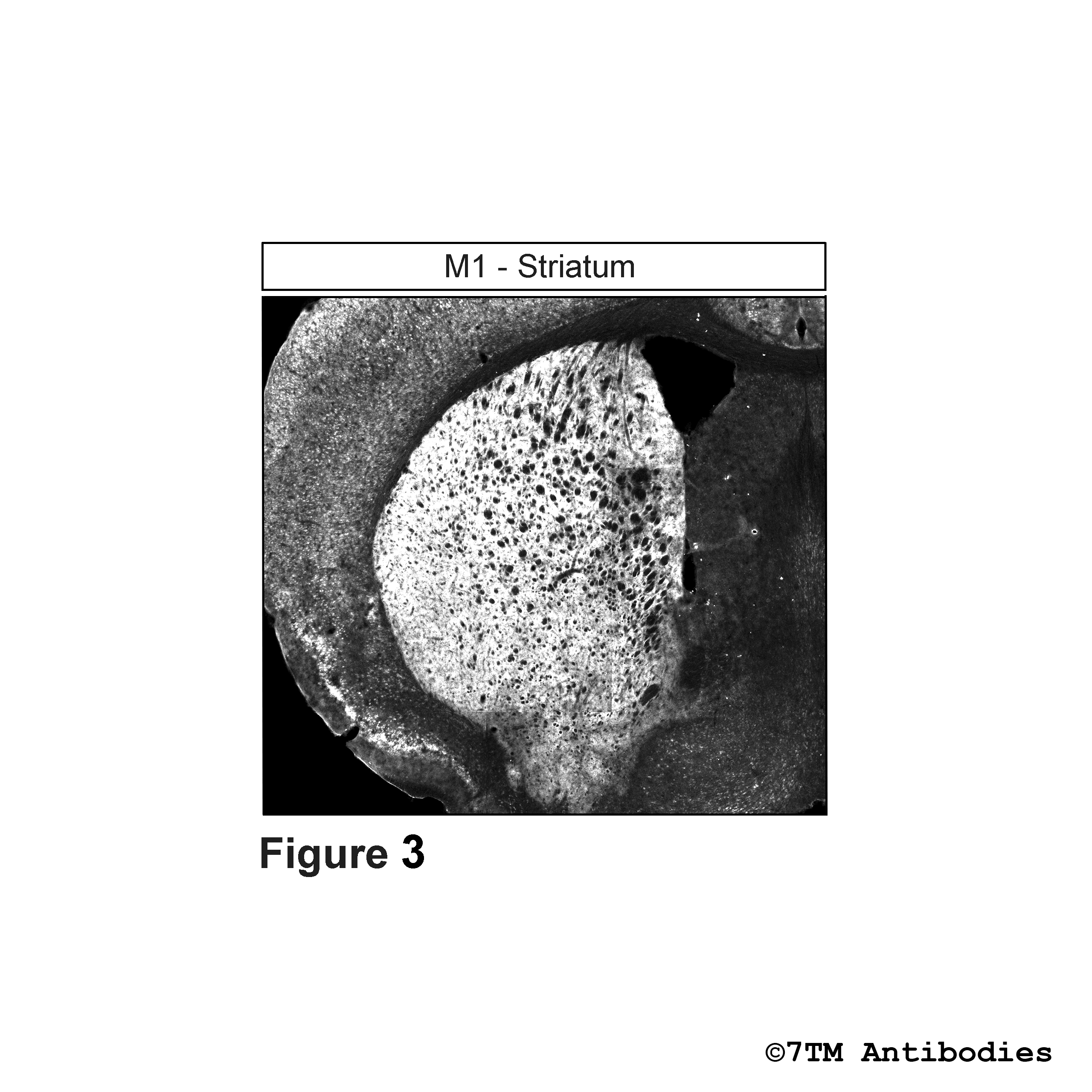 Figure 3. Immunohistochemical identification of  M1 Muscarinic Acetylcholine Receptor in striatum. Sections were dewaxed, microwaved in citric acid, and incubated with anti-M1 (non-phospho-M1 Muscarinic Acetylcholine Receptor) antibody (7TM0013N-IC) at a dilution of 1:100. Sections were then sequentially treated with biotinylated anti-rabbit IgG and avidin-biotin solution. Color was developed by incubation in 3-amino-9-ethylcarbazole (AEC), and sections were counterstained with hematoxylin.