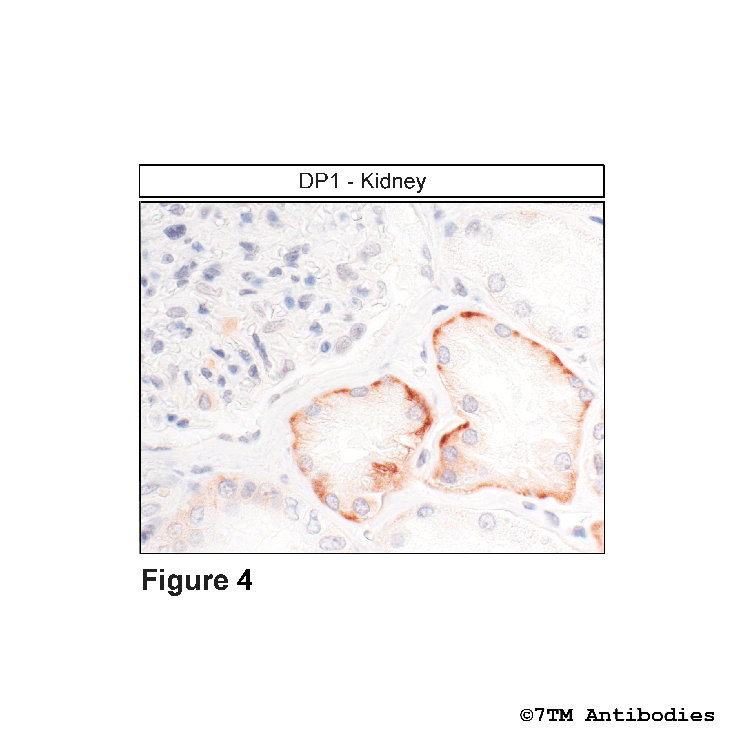 Figure 4. Immunohistochemical identification of DP1 Prostanoid receptor 1 in kidney. Sections were dewaxed, microwaved in citric acid, and incubated with anti-DP1 (non-phospho-DP1 Prostanoid Receptor) antibody (7TM0388N) at a dilution of 1:100. Sections were then sequentially treated with biotinylated anti-rabbit IgG and avidin-biotin solution. Color was developed by incubation in 3-amino-9-ethylcarbazole (AEC), and sections were counterstained with hematoxylin.