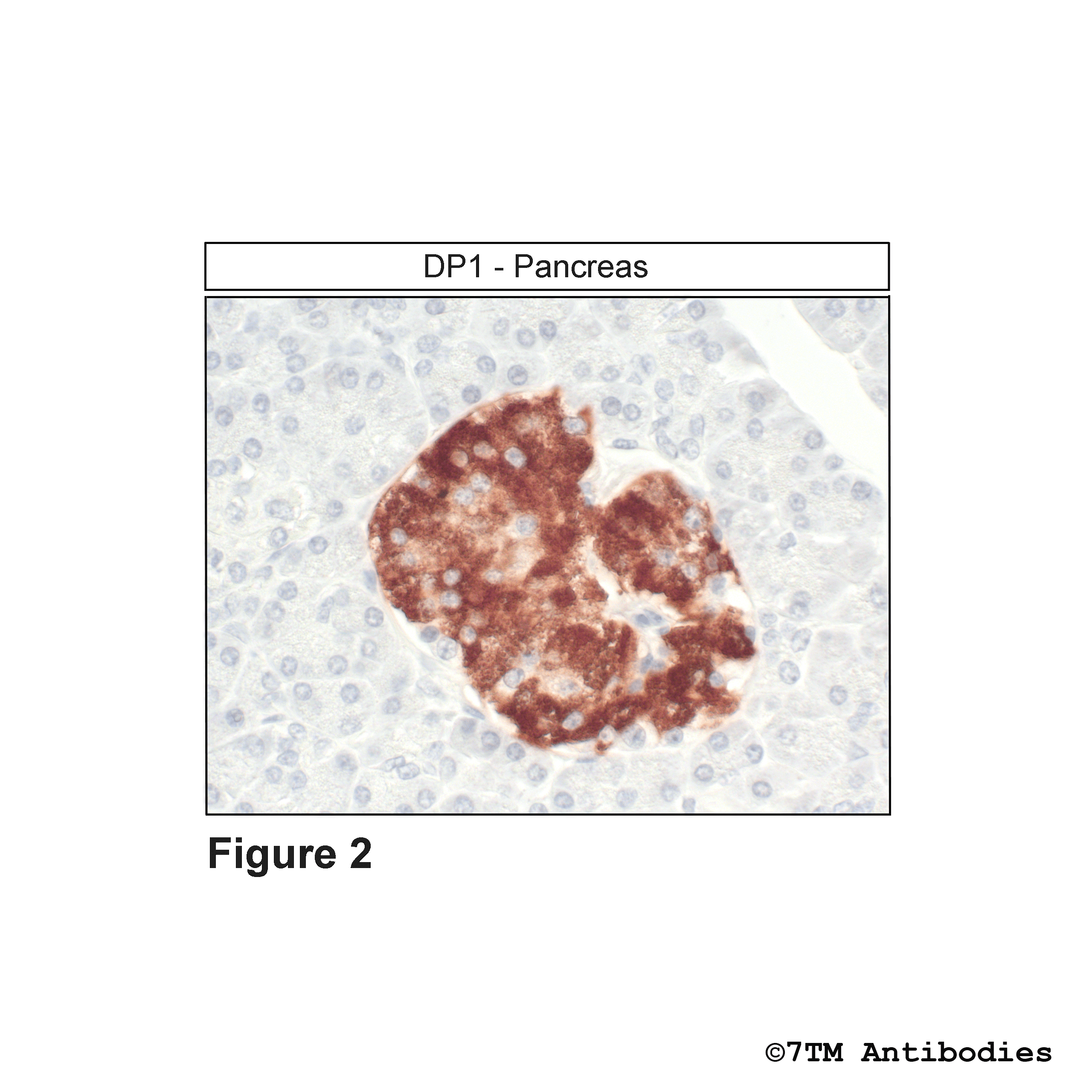 Figure 2. Immunohistochemical identification of DP1 Prostanoid receptor 1 in pancreas. Sections were dewaxed, microwaved in citric acid, and incubated with anti-DP1 (non-phospho-DP1 Prostanoid Receptor) antibody (7TM0388N) at a dilution of 1:100. Sections were then sequentially treated with biotinylated anti-rabbit IgG and avidin-biotin solution. Color was developed by incubation in 3-amino-9-ethylcarbazole (AEC), and sections were counterstained with hematoxylin.
