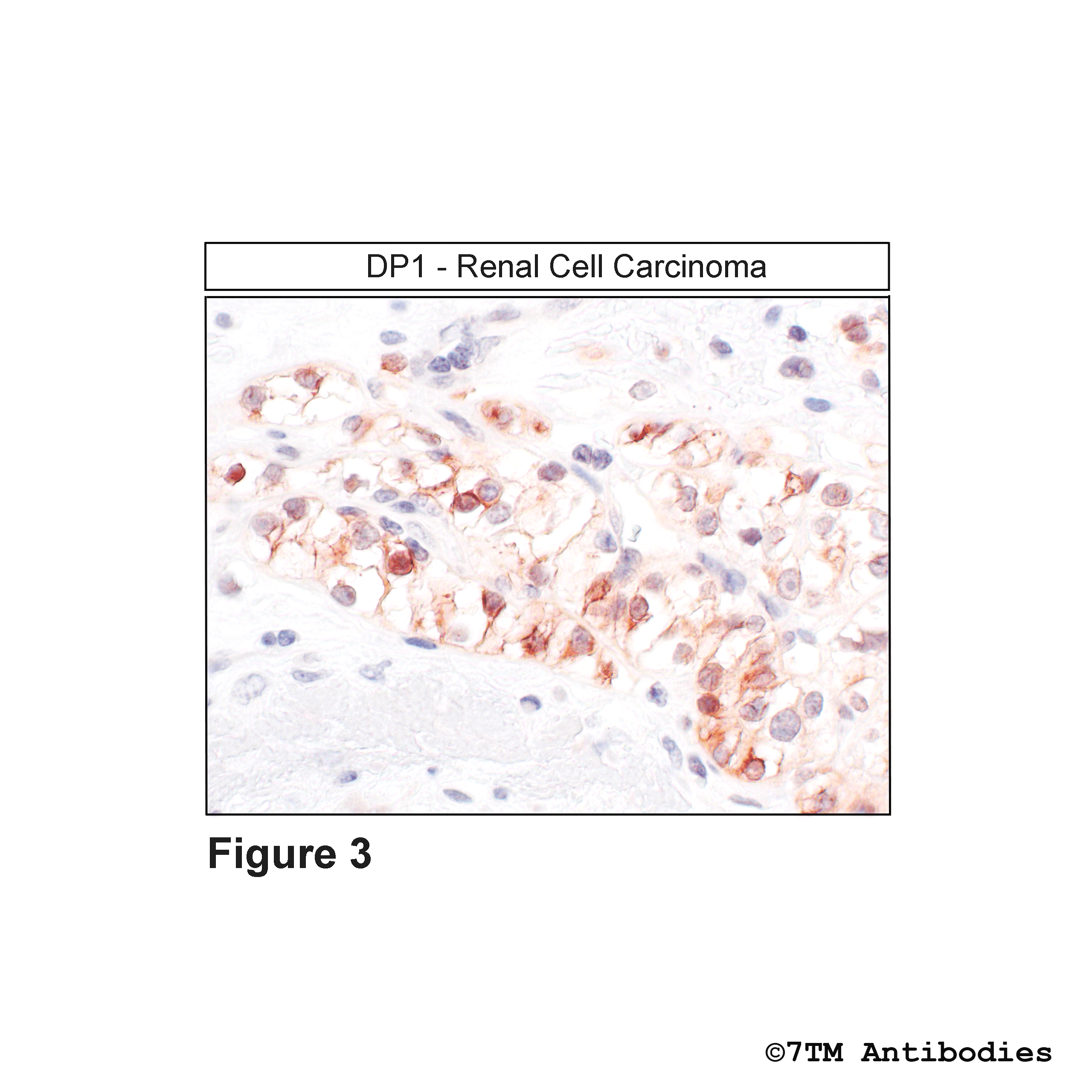 Figure 3. Immunohistochemical identification of DP1 Prostanoid receptor 1 in renal cell carcinoma. Sections were dewaxed, microwaved in citric acid, and incubated with anti-DP1 (non-phospho-DP1 Prostanoid Receptor) antibody (7TM0388N) at a dilution of 1:100. Sections were then sequentially treated with biotinylated anti-rabbit IgG and avidin-biotin solution. Color was developed by incubation in 3-amino-9-ethylcarbazole (AEC), and sections were counterstained with hematoxylin.