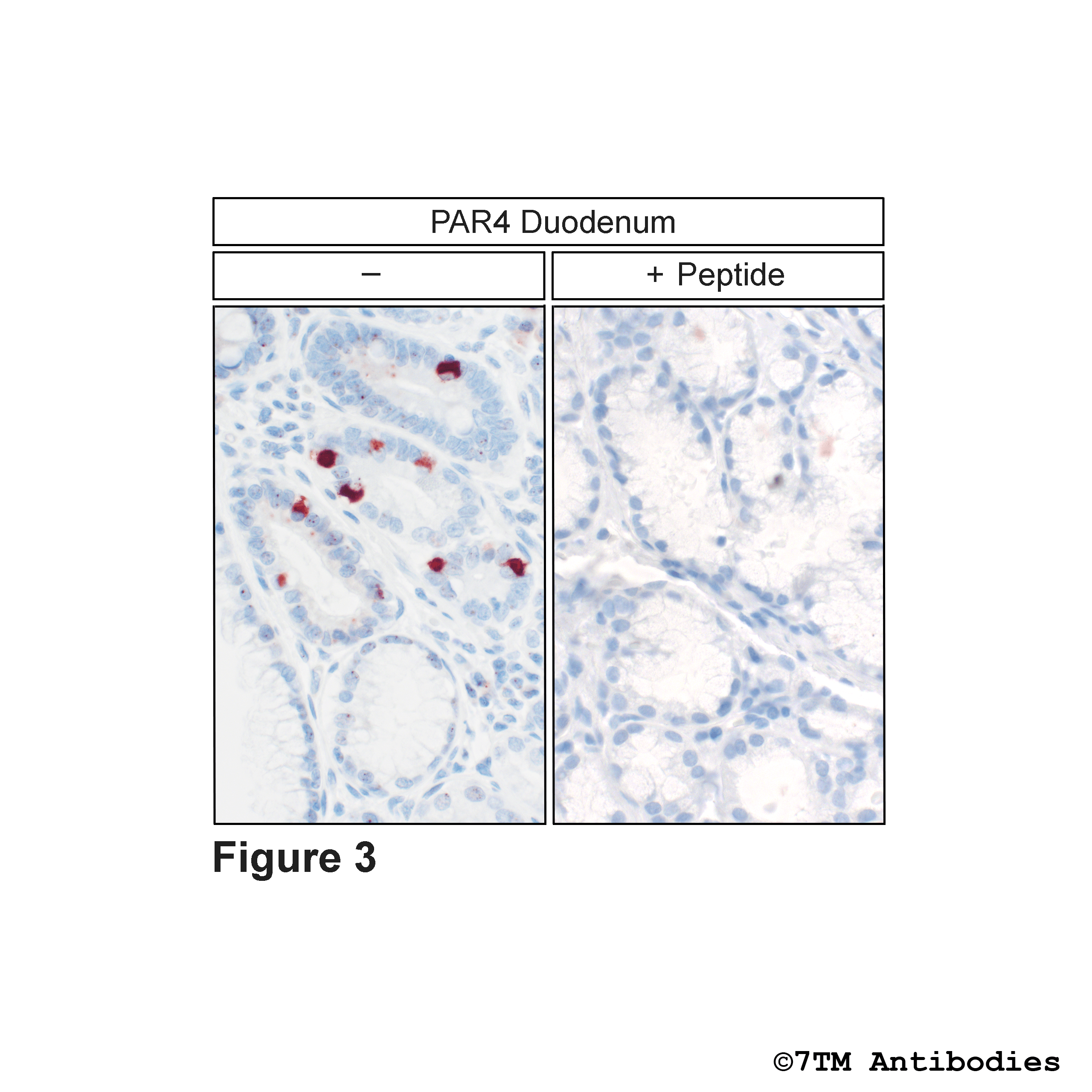 The non-phospho-PAR4 receptor antibody is directed against the distal end of the carboxyl-terminal tail of human Proteinase-Activated Receptor 4. It can be used to detect total PAR4 receptors in Western blots independent of phosphorylation. The PAR4 antibody can also be used to isolate and enrich PAR4 receptors from cell and tissue lysates. It also detects PAR4 in cultured cells and tissue sections by immunohistochemistry.