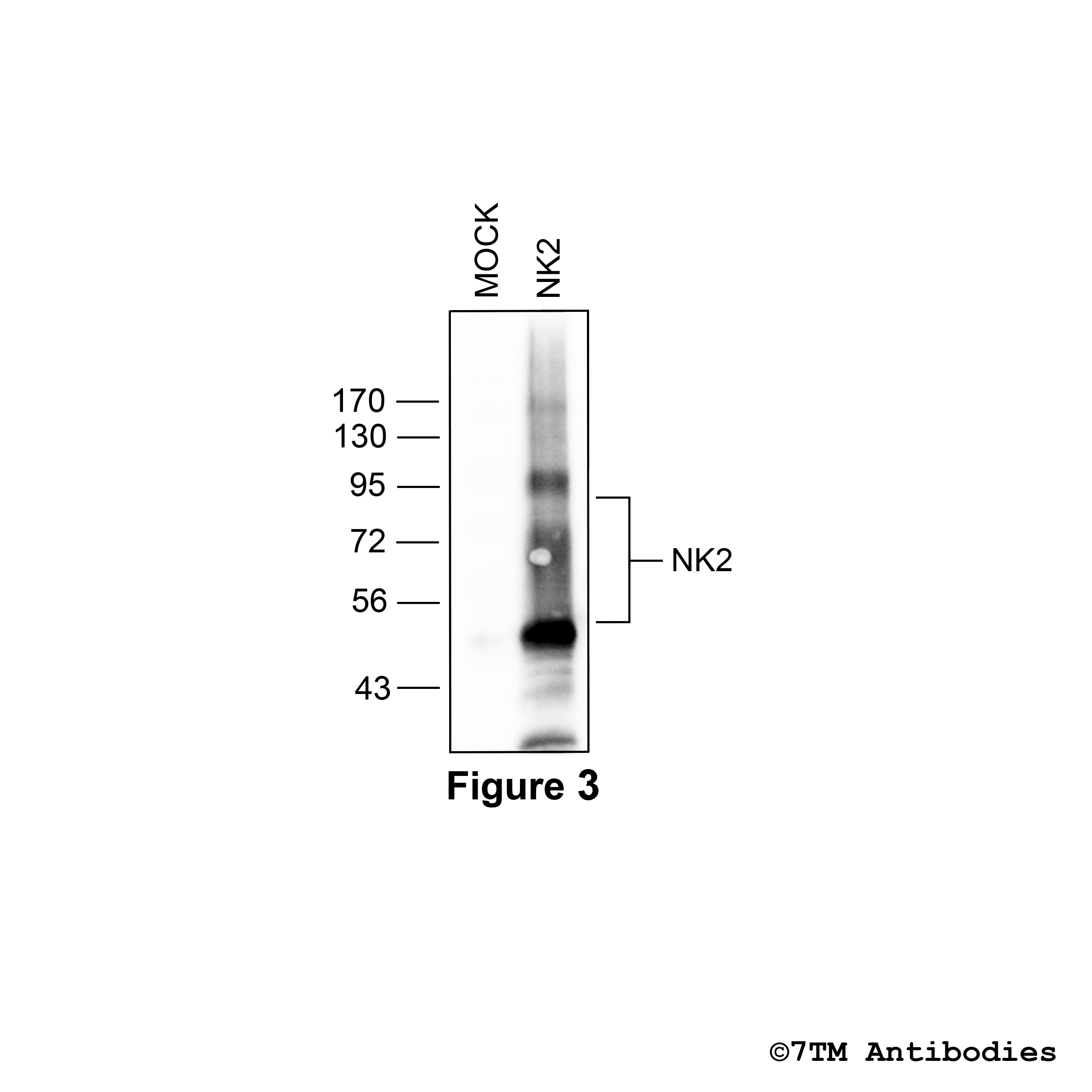 Figure 3. Validation of the Tachykinin Receptor 2 in transfected HEK293 cells. Native HEK293 cells (MOCK) or HEK293 cells stably expressing the Tachykinin Receptor 2 (NK2) were lysed and immunoblotted with the anti-NK2 antibody (7TM0361N-IC) at a dilution of 1:1000.