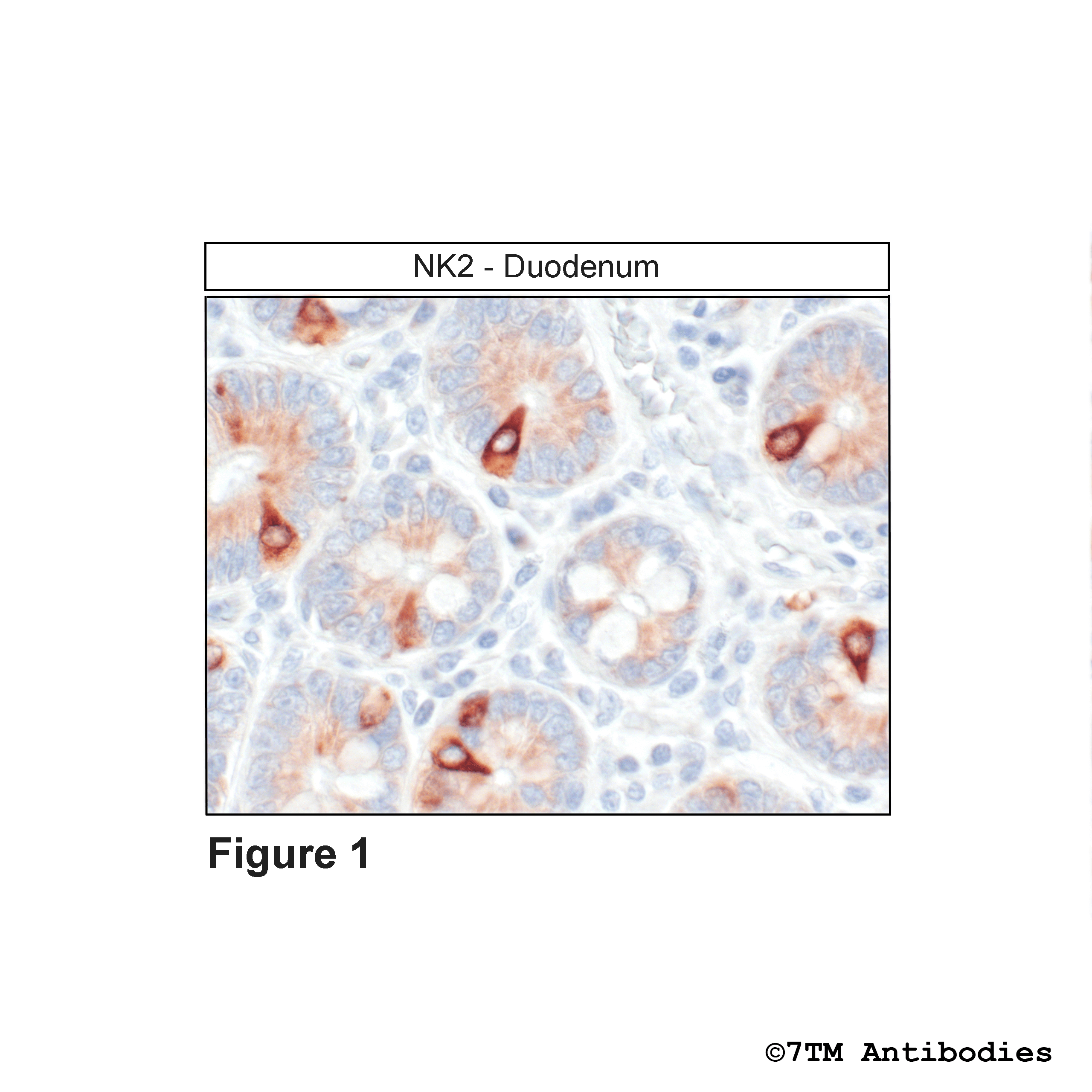 Figure 1. Immunohistochemical identification of Tachykinin Receptor 2 in duodenum. Sections were dewaxed, microwaved in citric acid, and incubated with anti-NK2 (Tachykinin Receptor 2) antibody (7TM0361N-IC) at a dilution of 1:100. Sections were then sequentially treated with biotinylated anti-rabbit IgG and avidin-biotin solution. Sections were then developed in 3,3-diaminobenzidine (DAB)-glucose oxidase and lightly counterstained with hematoxylin.